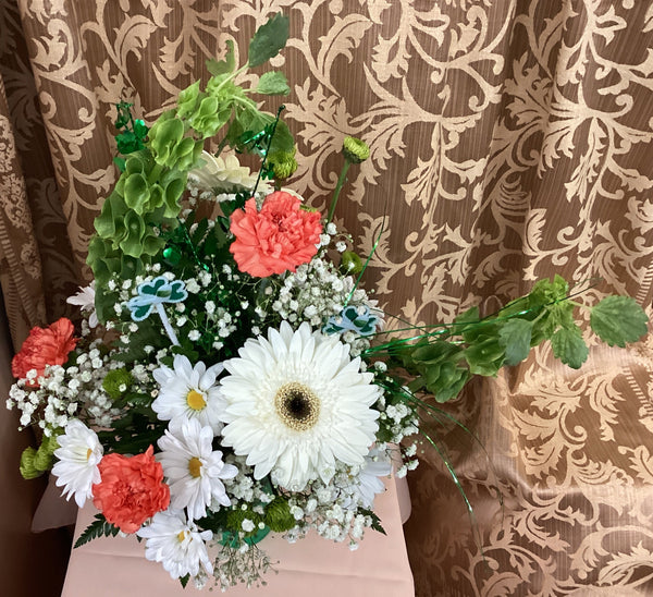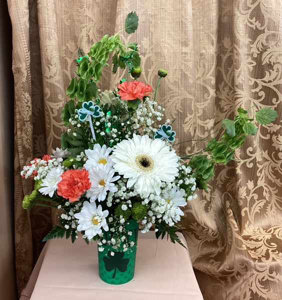 Orange carnations, bells of Ireland, white gerbera daisies, white pom daisies, green button daisies, baby’s breath, and decorative shamrock picks in a St Patrick’s day themed plastic cup.