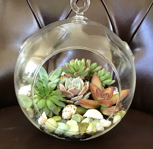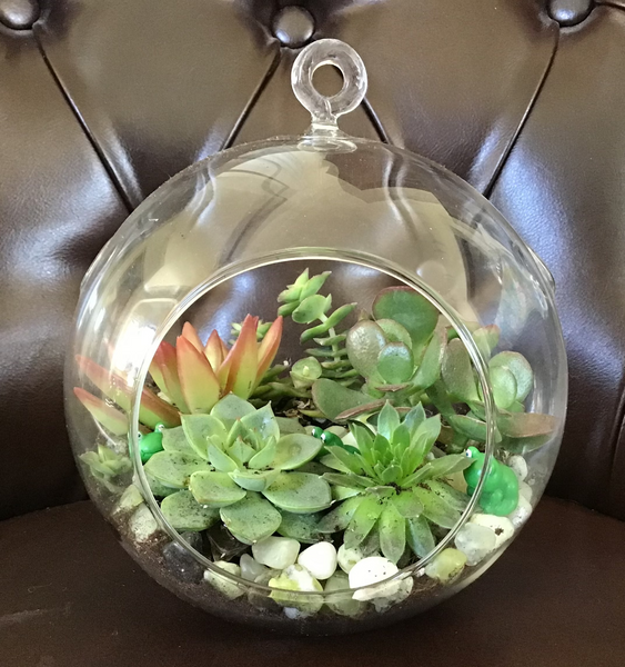 A few happy succulents and some cute little critters in a glass terrarium. Great for hanging or placing on a table. 6 inches in width.